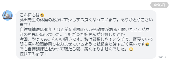 実際に自律訓練法をやったら股関節がいまのところ痛くなくなりました。というご報告いただきました。